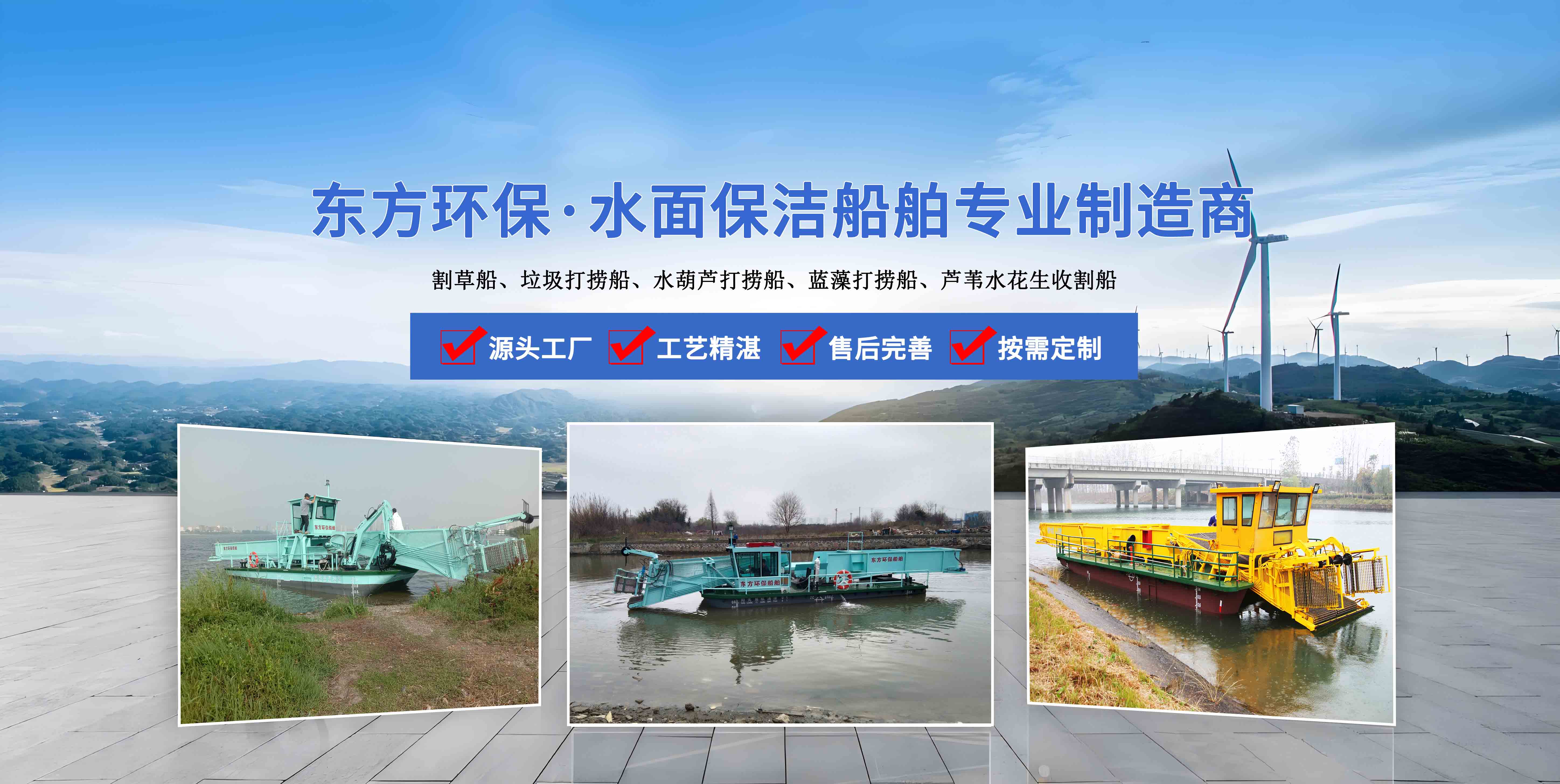 青州市東方環(huán)保機(jī)械制造有限公司位于山東省青州市,地理位置得天獨(dú)厚,是水面保潔船、水草收割船、、清漂船、滸苔打撈船、藍(lán)藻打撈船等水面船體的專業(yè)制造銷售廠家, 公司成立于2006年,公司先后與山東省黃河造船廠、中船重工702研究所、青島海洋大學(xué)、渤海船舶職業(yè)學(xué)院等機(jī)構(gòu)建立了長期合作關(guān)系.。